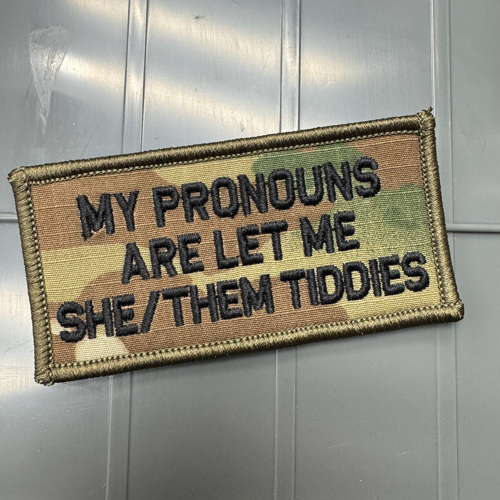 As Seen on Socials - My Pronouns Are Let Me She/Them Tiddies - 2x4 Patch - Multicam w/Black