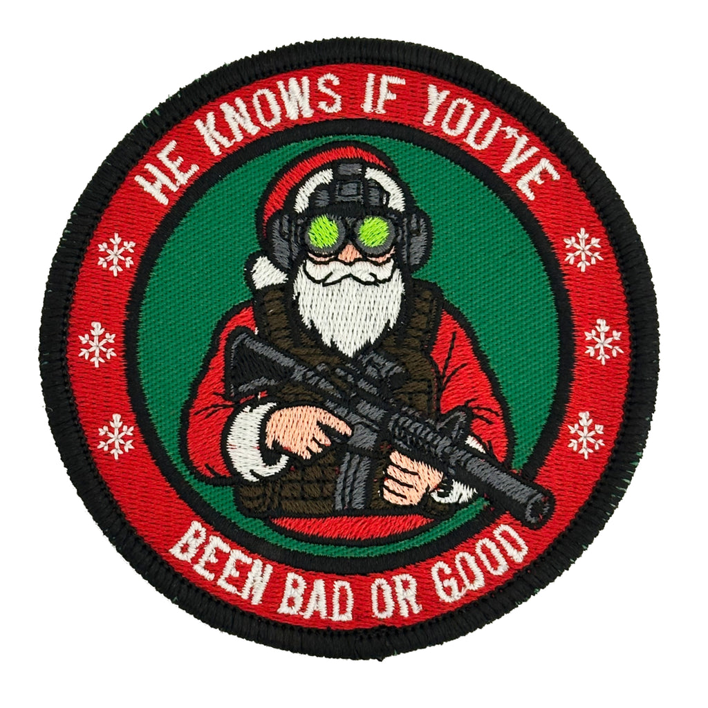 December 2025 POTM - This 4" round embroidered patch features a Tactical Santa in full operator mode—glowing NODs, a plate carrier, and an automatic rifle like he’s clearing the North Pole one naughty list at a time. He’s not here for milk and cookies… he’s here for accountability. Crisp stitching and bold detail bring this holiday badassery to life, backed by the warning every troublemaker should take seriously: “HE KNOWS IF YOU’VE BEEN BAD OR GOOD.”